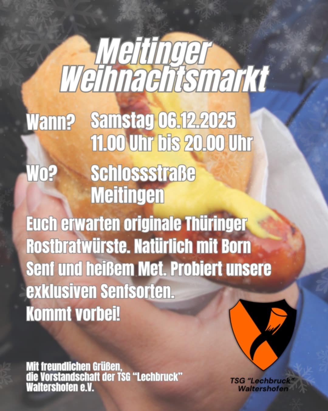 Hier gibt es immer aktuelle Informationen zum Verein. Die nächsten Termine in Kürze:Die TSG auf dem Meitinger Weihnachtsmarkt 🎅🤶🎁🎄